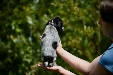 This beautiful black and white female GSP puppy from Lucy x Finn is a gentle soul. She will be about medium in size, and her colour will darken significantly still. She will be a gorgeous black roan colour. This girl can go in any direction, from hunting to family hiking.