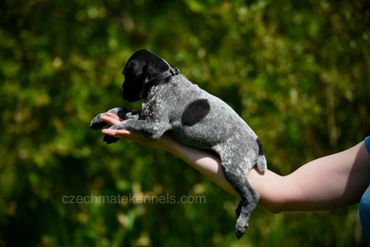 Beautiful female GSP puppy from Nova x Finn. This sweet girl will be medium to large in size, and will be able to go in any direction of your choosing. She has a sweet even temperament, and would excel as a hunting buddy, active family pet or for the outdoor enthusiast. This puppy will still darken up a lot in next few months.